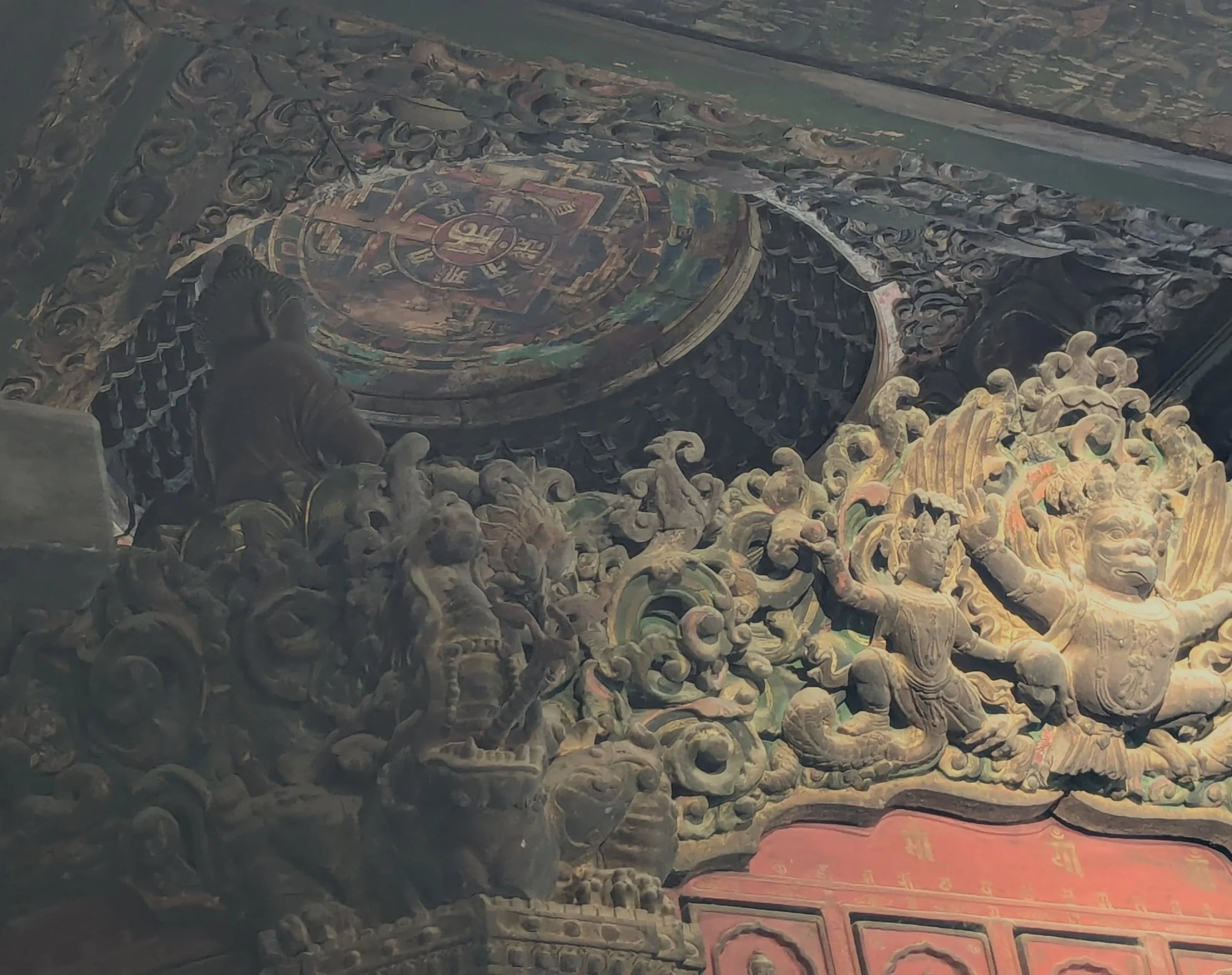 On our final day in Beijing, we take a taxi across the city to a Ming Dynasty Buddhist temple about 45 minutes west of downtown. It is Fahai Si, “Dharma Ocean Temple,” and it dates to the mid-15th century CE. Arriving at the top of the wooded hill, we enjoy the smell of pine, the sunshine, and cooler morning air. Fahai’s main building contains original wall paintings from the Yuan, Ming, and Qing Dynasties that are kept in the dark to preserve their vibrancy. We are given shoe covers and flashlights. Entering the large, shadowy space, we come face-to-face with three colossal Buddha statues - Dipankara, Shakyamuni, and Maitreya. This grouping is called the “Buddhas of the three times” - past, present, and future eras - and it is emblematic of Mahayana Buddhism. These are replicas of statues that were destroyed in the Cultural Revolution of the 1960s. They have “mandorla,” full body halos, in the lovely style that originated from the Newar artists in Nepal, and thus are evidence of the presence of esoteric Buddhism in China. On the ceiling above each Buddha is a “mandala,” a geometric painting of a sacred realm also associated with esoteric or tantric Buddhism, and these are repeated in a tile pattern that covers the entire ceiling with Sanskrit lettering and bright gold, reds, and blues. On the walls, we find evidence of the conservation monitoring program here, where cracks in the walls are being measured using small metal objects that look like bandaids. We also find vast depictions of bodhisattvas but before we can identify them in detail, we are asked to leave. The tension between preservation and access is palpable in this moment. Fortunately, this temple has been the subject of a large digitization project and we can see reprinted images in another building. There, a member of the staff tells us more about the history and use of the building as a monastery in the past. When Professor Sujatha Meegama asks him about the presence today of bowing platforms, as well as fruit and colorful silks that appear to be offerings, he hesitates. Eventually he replies that, while this is a not a place of practice, they do try to allow folks to do simple devotions. The tension between preservation and religion is apparent as well.